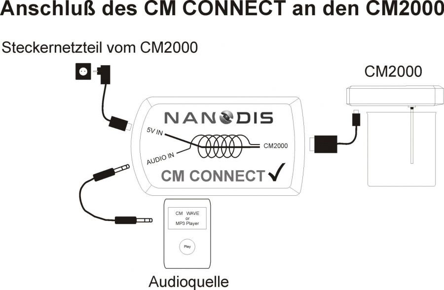 Na CM CONNECT priključite npr. vaš pameten telefon, računalnik ali tablico, na katerem imaste posneto glasbeno datoteko s pozitivno vsebino, gonge, glasbo, molitvijo itn. CM CONNECT ta zvok zmodulira in ga preko elektrod v obliki elektrodnega toka vodi odda.