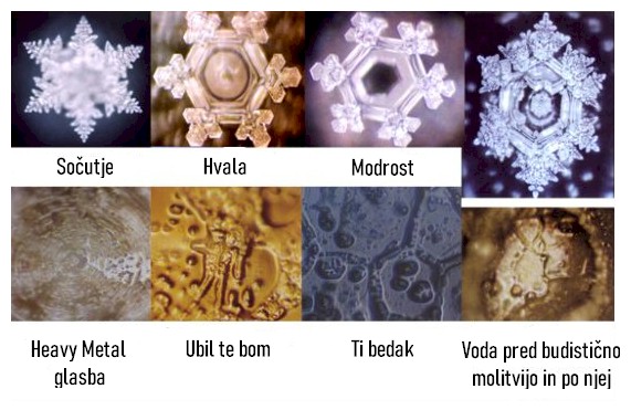 Po izgovarjanju pozitivnih besed, predvajanju spodbudne glasbe in celo molitvi v kozarcih vode so Emotovi poskusi pokazali nastanek impresivnih vodnih kristalov (vidnih pod mikroskopom). Ko pa je bila voda izpostavljena strašljivim človeškim dejanjem ali zvokom, kot sta kričanje ali prepir, so se ti vodni kristali pod mikroskopom "porušili".
